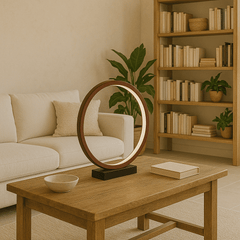 LAMPA STOŁOWA RAVELLA S OBRĘCZ BRĄZOWA IMITACJA DREWNA PODSTAWA CZARNY MARMUR