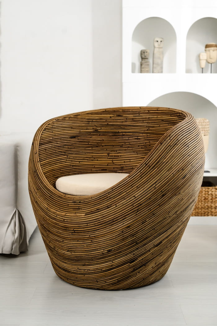 Ręcznie wykonany mebel z naturalnego rattanu, charakteryzujący się lekką konstrukcją oraz wygodnym, wyplatanym siedziskiem.