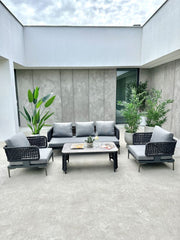 ZESTAW OGRODOWY ALUMINIOWY MAKSYMO Z SOFĄ 3-OSOBOWĄ, 2 FOTELAMI I STOLIKIEM KAWOWYM - SZARY